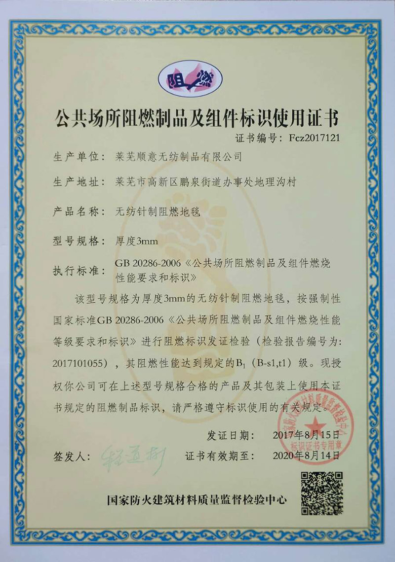 • 本公司生產的無紡阻燃地毯檢測合格